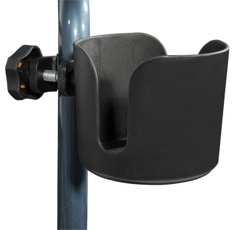 Plastic drink holder is slotted on two sides to hold a cup with handles and is accessible to left or right-handed people * It can also hold a glass can or bottle * The rugged plastic clamp has a large easy-to-tighten lever knob * The clamp fits a 1 diameter tube and comes with a sleeve to reduce it to fit 7/8 tube frames *