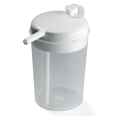 Specifically designed to eliminate the need to sit up or raise the head while drinking * Fluid will not spill from the cup even if it is lying on its side * Closing the valve on the lid stops the flow of fluid and gives the user control of intake amount by sucking on the spout * Ideal for people who are confined to bed need to drink lying down or who have limited neck/head mobility * Helps reduce the risk of choking promotes independent drinking and reduces caregiver assistance * Engraved measurement markings in 25 ml increments * Use with hot and cold fluids * Holds 8.5 oz. (250 ml) * Dishwasher autoclave and microwave safe * Comes with 11 straws * Cup: diameter - 2 7/8 (7.3 cm) overall height - 4 5/8 (11.7 cm) spout length - 1 1/2 (2.7 cm) volume - 8.5 oz. (250 ml)- Straw: outside diameter - 1/4 (.64 cm) length - 3 21/32 (.93 cm) * Warranty: 12 months parts and labor