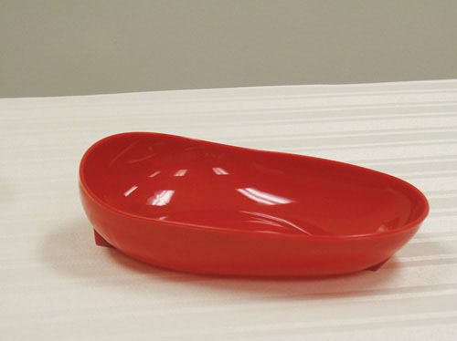 Redware scooper dish * Combination plate/bowl has a contoured lip that can be used to push food onto cutlery * Designed for people with limited muscle control or the use of only one hand * Measures 6 x 7.5 x 1.75 (4.4 cm) deep on the high side * Microwave and dishwasher safe * Research indicates that people with AlzheimerÊs Disease experienced a 24% increase in food intake and 84% increase in liquid intake when eating and drinking with tableware that offers a high contrast color *