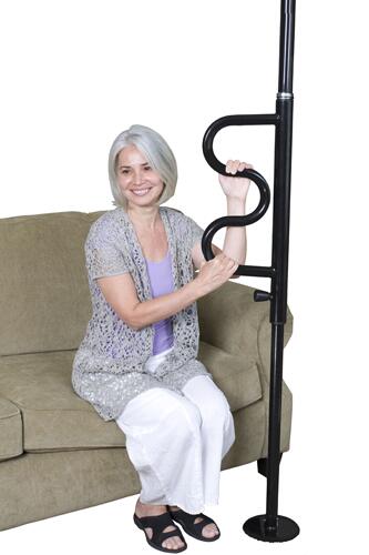Curve Security Pole -Black * 2 Products in 1: Floor to ceiling pole with pivoting Curve Grab Bar that locks in place every 45 degree * Portable: Main pole easily separates into two 53 pieces * Adaptable: No need for wall mounts * Rubber pads protect ceiling and floor * Installs in minutes with no tools required * Rust resistant zinc plated steel * Fits ceiling height range of up to 10' * Weight of product: 20 lbs * Weight of Capacity: 300 lbs *