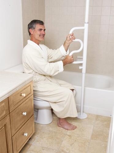 Curve Security Pole - White * 2 Products in 1: Floor to ceiling pole with pivoting Curve Grab Bar that locks in place every 45 degree * Portable: Main pole easily separates into two 53 pieces * Adaptable: No need for wall mounts * Rubber pads protect ceiling and floor * Installs in minutes with no tools required * Rust resistant zinc plated steel * Fits ceiling height range Fits ceiling height range of up to 10' * Weight of product: 20 lbs * Weight of Capacity: 300 lbs *