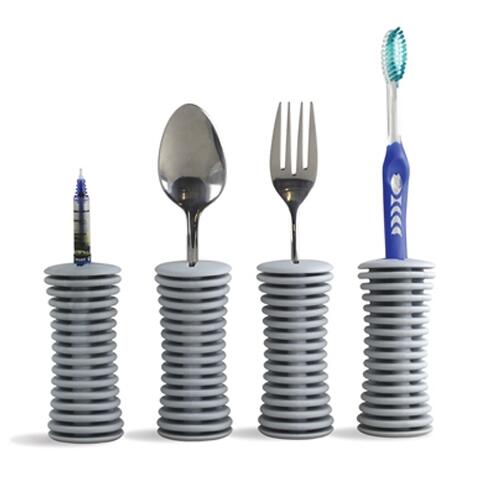 Ergonomic soft built-up handle makes it easier for people with arthritis or limited grasping ability to self-feed and perform other activities of daily living * Multi-purpose handle easily and instantly creates a larger gripping surface on most standard eating utensils -forks knives spoons - eliminating the need for special built-up utensils * Soft ribbed handle fits comfortably in the hand and reduces pain and cramping * Can also be used with other everyday items such as pens pencils toothbrushes crochet hooks and knitting needles * 1 ó (4.4 cm) diameter handle accommodates utensils with widths from ¬ - 1 (.64 - 2.54 cm) * Measures 3 5/8 (9.22 cm) * Dishwasher safe * Package of 4 * Warranty: 12 months * Handles only--utensils toothbrushes etc. are not included