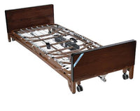 Bed with Full Length Side Rails & 80 Inner Spring Mattress *The Delta 1000 is truly universal because the headboards and footboards are completely interchangeable with Drive's and most other manufacturers bed ends old and new *The transition box mounted on the foot section is key to interchangeability *The transition box allows you to change the rotation of the high-low shaft *Headboard is taller than footboard to better fit home decor *The wood grain panels are break and scratch resistant *Once installed the high/low shaft will stay with the bed to eliminate loss or forgetting on future installations *Labels and color-coded springs assure accurate installation of side rails for patient safety *Unique motor is completely self-contained to reduce weight and noise *9.5 to 23.5 deck height *Easy to set up *Top mounted Hi/Lo crank accessability *Weight capacity: 450 lbs *Height adjustable motor comes pre-installed on the foot section *Caster easily moves from standard to low bed position *The motor assembly can be installed and removed with patient in bed *The motor is UL approved *In the event of a power failure a 9 volt battery located in the motor can lower the head and foot sections nine times *New and improved hand pendant has large easy to use controls *Bed ships in two cartons *Channel frame construction provides superior strength and reduced weight *Zinc coated spring deck *Limited 5 year warranty on motor and hand control lifetime warranty on welds and frame 1 year warranty on all other parts and components