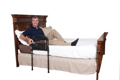 Extendable Legs - Provides added stability when standing up * Ergonomic Cushion Handle - Allows for easy transfer in and out of bed * 4-Pocket Organizer - Provides storage space for handy items * Anti-Slip Grips - Secures rail in-between mattress and bed frame * Height Adjustment - Accommodates any home or hospital bed * Easy Installation - Installs in seconds with no tools required * Depth of horizontal support structure under mattress: 20 * Weight capacity: 300 lbs * Weight of product: 9 lbs * Steel frame with durable powder coat finish