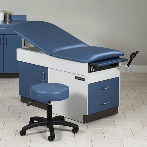 * 58 /72 extended L x 28.5 W x 31? H * Premium vinyl upholstery over 2 firm foam padding (5 cm) * Full 28.5 width for patient comfort (72.39 cm) * Air-spring adjustable backrest from 4§ to 68§ * Coated two position adjustable stirrups * Pull-out leg rest on steel track * Easy care Gray laminate base * Chip resistant edges * Large side storage compartment with shelf is accessible from both sides (no right or left handed tables) * 2 drawers with all steel slides * Built with plywood and laminate panels that are California CARB II compliant * Top sections are easily replaceable in the field * Adjustable feet for leveling * Paper dispenser included * 400 lbs. load capacity under normal use (181.43 kg)