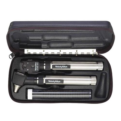 Comes in a hard fitted case * 2.5V Otoscope also has built in throat illuminator - two in one instrument * Features halogen illumination and fiber optics for a cool light with no reflections or obstructions plus a rectangular viewing lens for instrumentation under magnification * 2.5V PocketScope handle has a smooth rheostat to control light intensity and features a handy pocket clip *