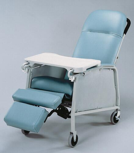 The standard of the industry and the recliner that started it all * This first recliner specifically designed to improve the comfort and mobility of residents in extended care facilities * The Lumex three position recliner easily adjusts into any one of three positions: sitting TV or full recline * Recliners offer numerous therapeutic benefits including position changes that can aid in circulation and ease discomfort from respiratory heart and other ailments * A position lock allows only the caregiver to secure the chair in any one of the three easily attained positions * Recliner encourages natural relaxation and improved blood circulation * Flex-o-Lator seat support system increases comfort by reducing the risk of bottoming out * Ergonomically designed seat and back with varied density foam construction provides correct support * Articulating headrest quickly adjusts to maximize individual comfort requirements * For safer easier transport the Lumex three position recliner features two four inch swivel casters with wheel locks and four inch fixed front wheels * The molded activity table can be fixed in position or left unsecured for easy exit from the recliner * Durable welded steel epoxy coated frame is easy to clean and maintain * Weight bearing capacity: 250 pounds * Warranty on frame: Limited 2 Years; Warranty on upholstery: Limited 1 Year; Warranty on all other components: Limited 1 Year *