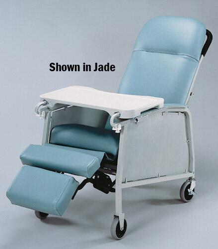 The standard of the industry and the recliner that started it all * This first recliner specifically designed to improve the comfort and mobility of residents in extended care facilities * The Lumex three position recliner easily adjusts into any one of three positions: sitting TV or full recline * Recliners offer numerous therapeutic benefits including position changes that can aid in circulation and ease discomfort from respiratory heart and other ailments * A position lock allows only the caregiver to secure the chair in any one of the three easily attained positions * Recliner encourages natural relaxation and improved blood circulation * Flex-o-Lator seat support system increases comfort by reducing the risk of bottoming out * Ergonomically designed seat and back with varied density foam construction provides correct support * Articulating headrest quickly adjusts to maximize individual comfort requirements * For safer easier transport the Lumex three position recliner features two four inch swivel casters with wheel locks and four inch fixed front wheels * The molded activity table can be fixed in position or left unsecured for easy exit from the recliner * Durable welded steel epoxy coated frame is easy to clean and maintain * Weight bearing capacity: 250 pounds * Warranty on frame: Limited 2 Years; Warranty on upholstery: Limited 1 Year; Warranty on all other components: Limited 1 Year *