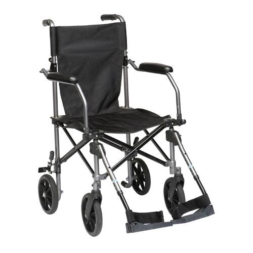 Easily transportable and come with a compact carry bag making it ideal for traveling * Ideal for use indoors and outdoors * Folding backrest * 18 square nylon seat canvas with lift up straps * Comes with parking wheel locks * Comes with padded flip up desk arms and height adjustable footrests * 8 solid tires * Weight capacity 250 lbs * Seat 18 W x 18 D